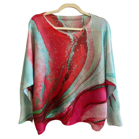 Tie Dye Fuchsia and Aqua Round Neck, Loose Knit Ladies Sweater