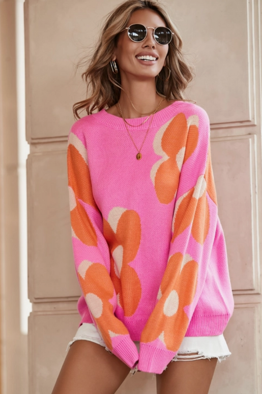 Ladies Flower Print Slouchy Sweater - Pink and Orange