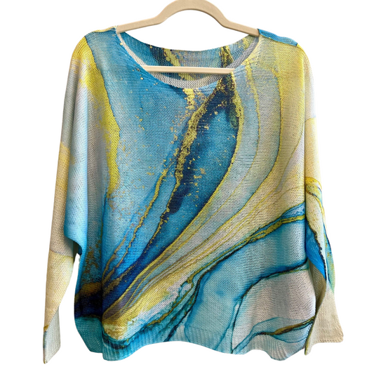 Tie Dye Blues and Lime Green Round Neck, Loose Knit Ladies Sweater