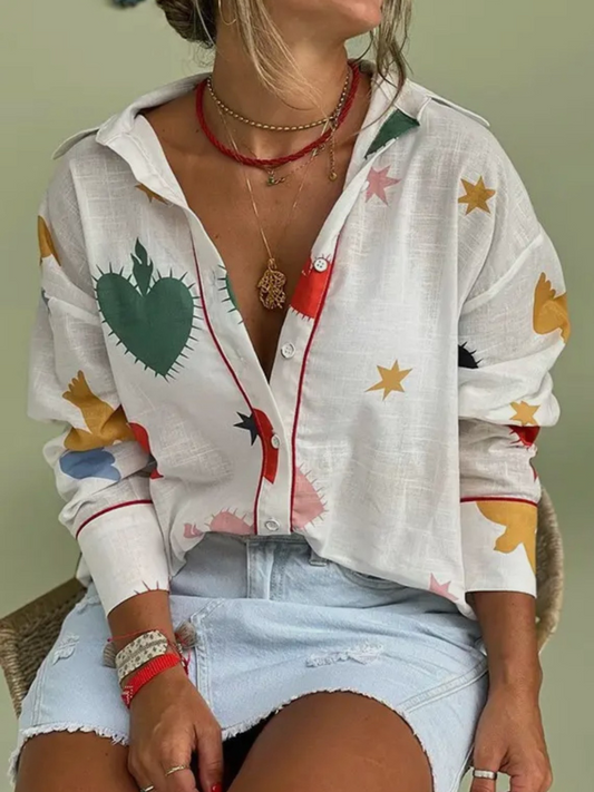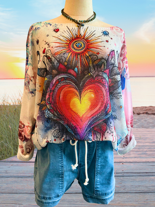 Hearts Aglow - Ladies Loose Knit, Round Neck, Boho Sweater