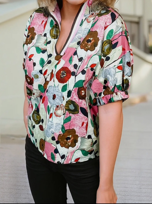 Poppies Floral Print Slit V-neck Short Sleeve Blouse