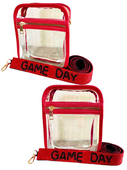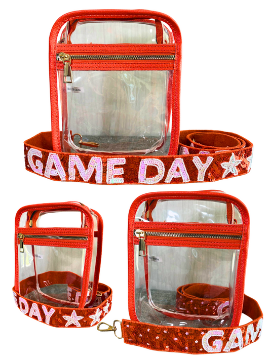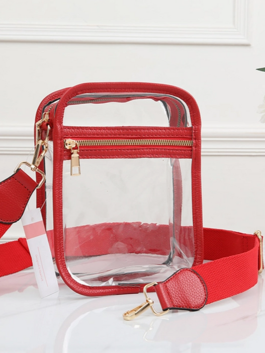 Clear Stadium Bags - Red or Orange Vegan Leather Trim, Crossbody Bag with Strap