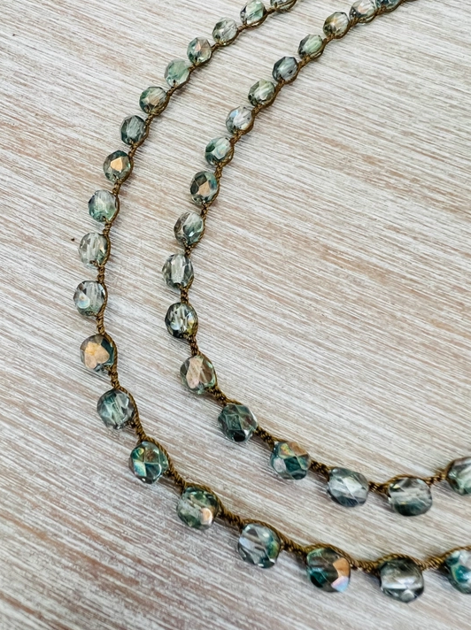 - Materials: Hand-crafted crystal necklace with shell button toggle/loop closure